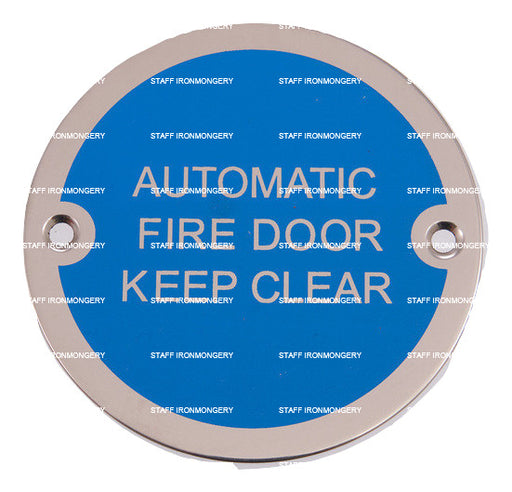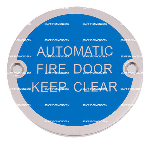 Bary Automatic Fire Door Keep Clear Sign Satin Stainless Product Information Use: Commercial high use areas Dimensions: 76mm disc Fixing: wood ...